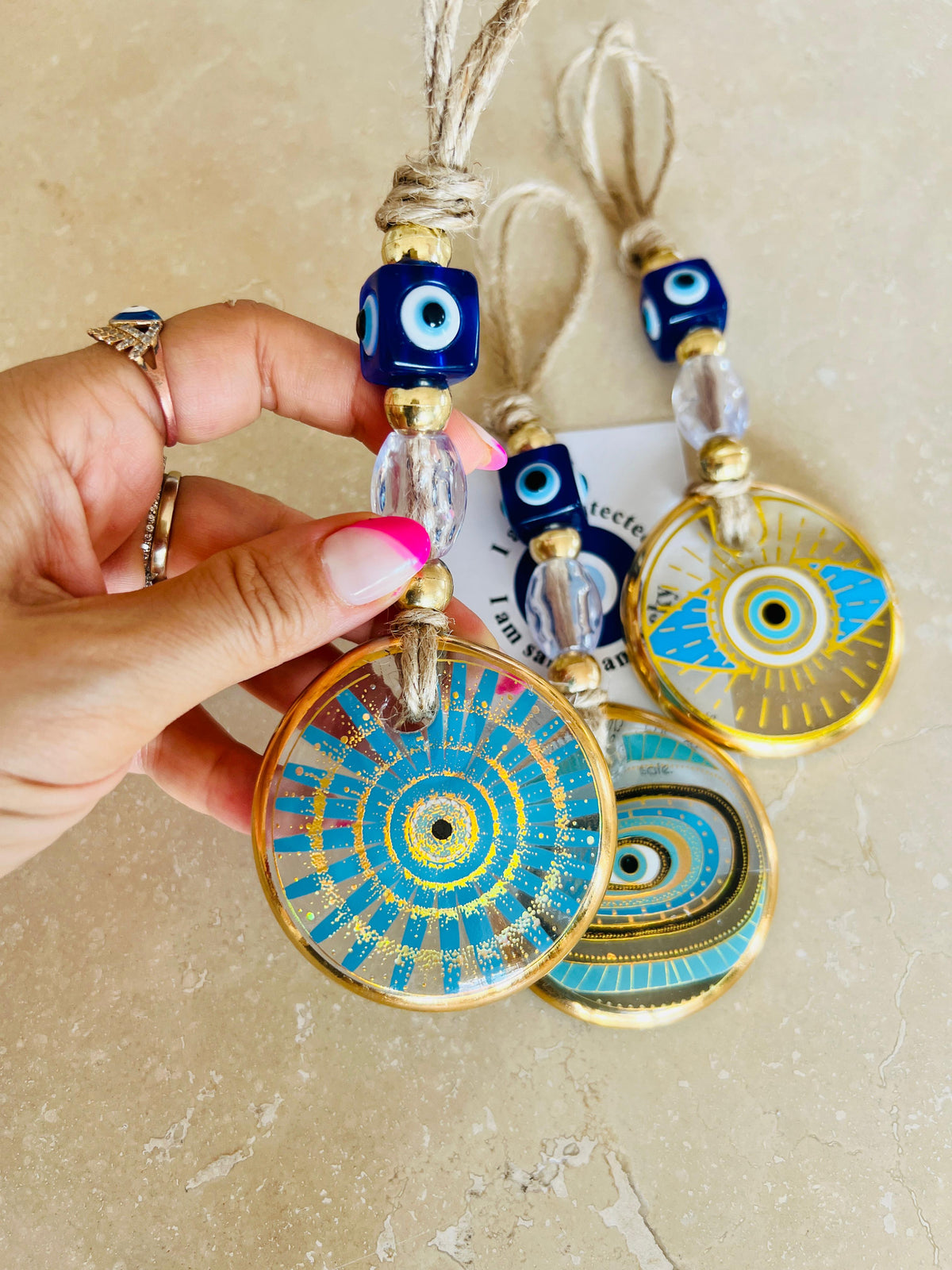 • %100 el emeğiyle üretilen nazar boncuklarımız, tamamen el boyaması ve baskılı olarak hazırlanır.
