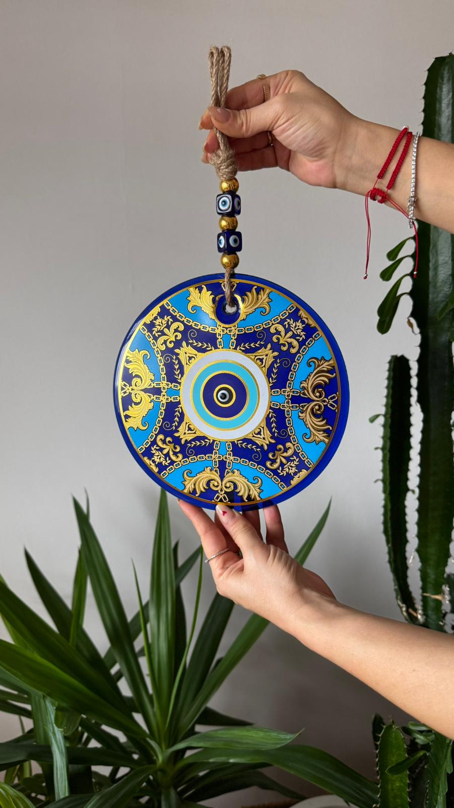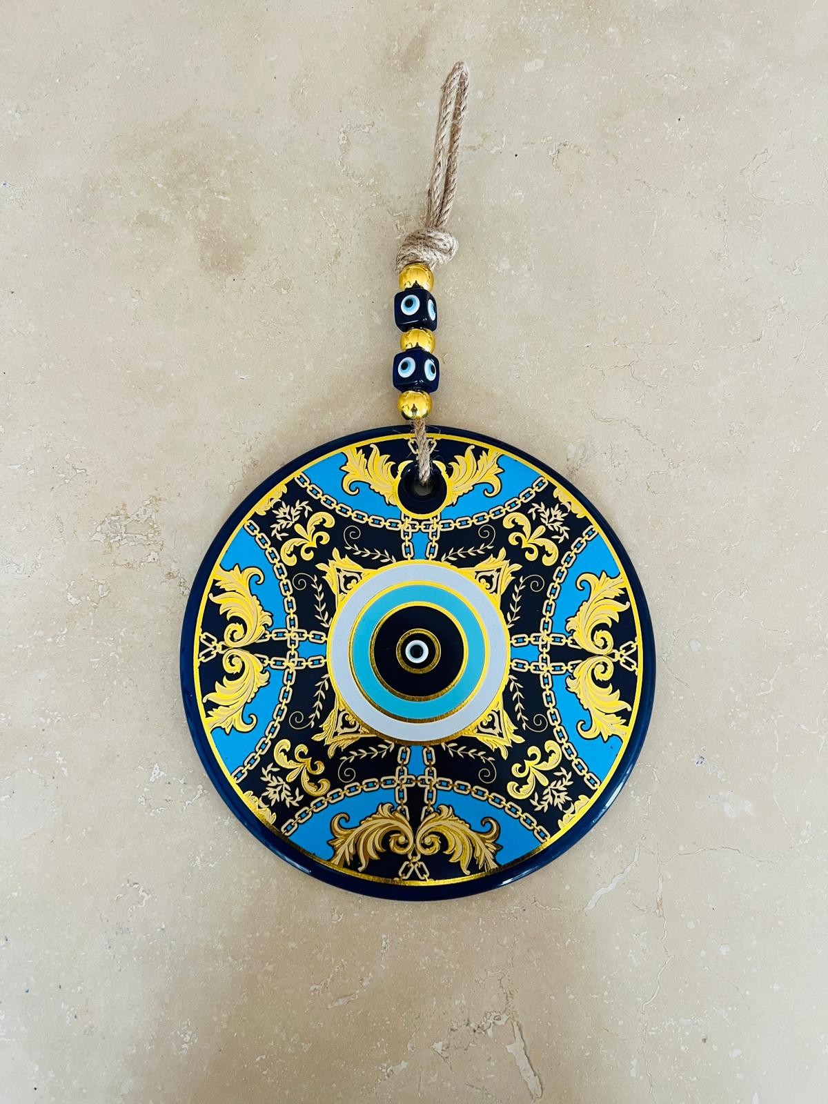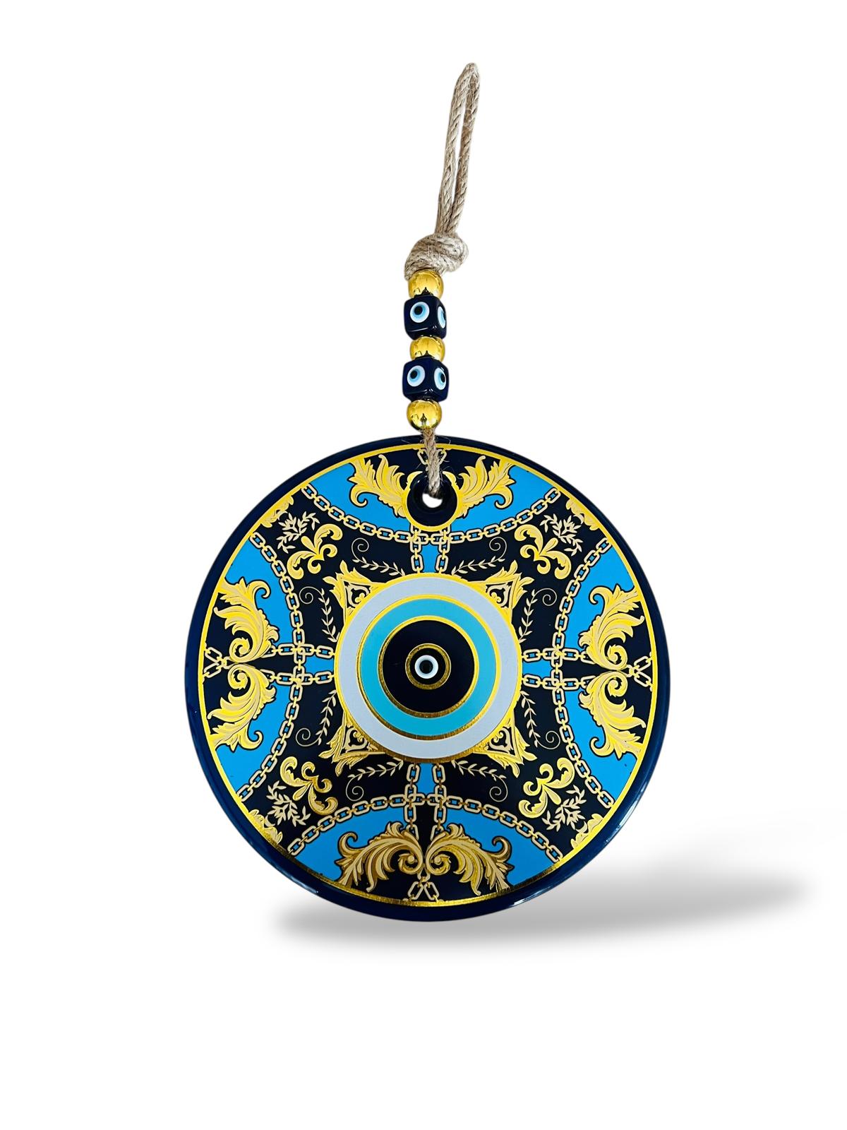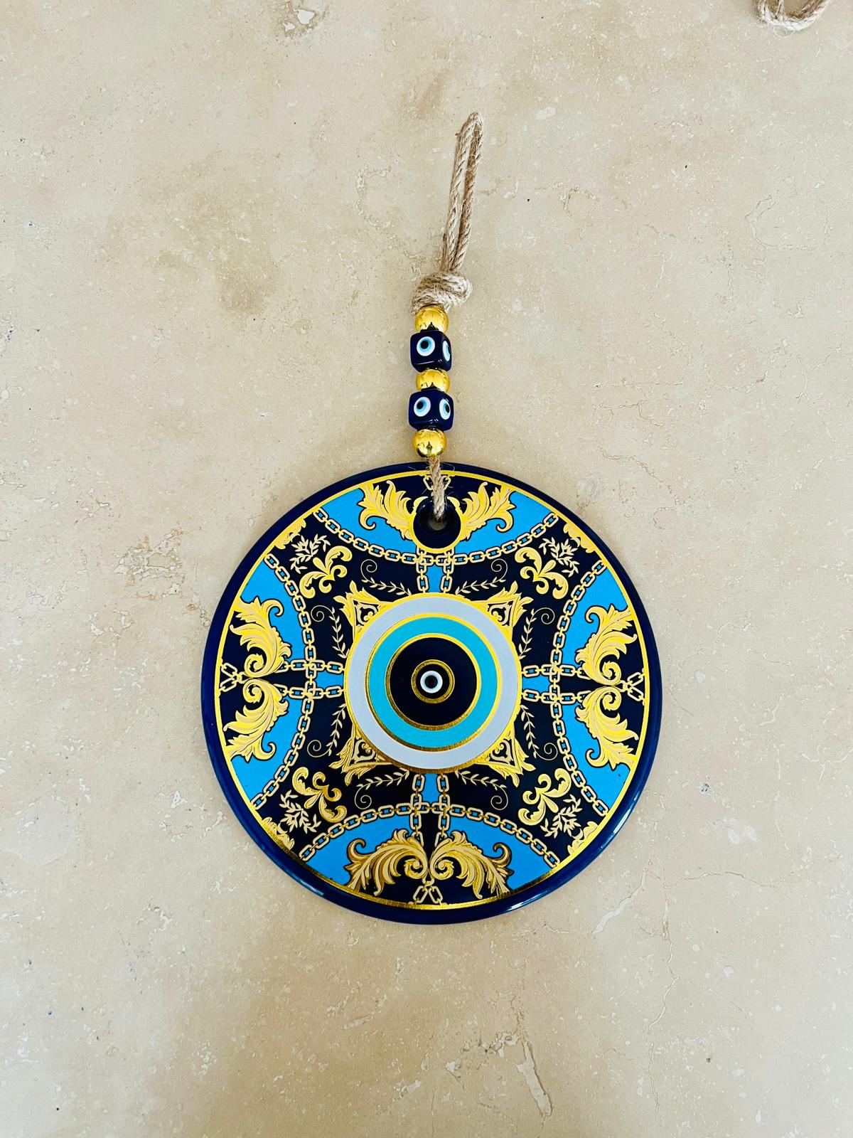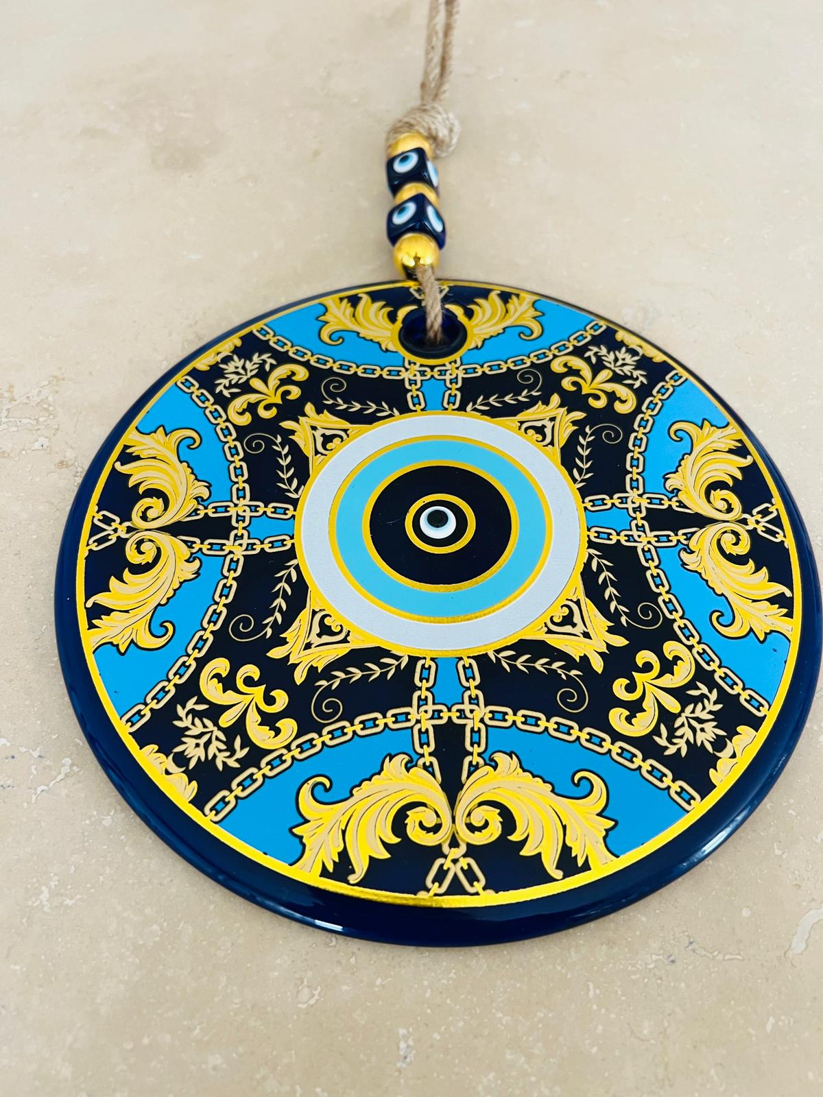 Lacivert, mavi ve altın tonlarının uyumlu birlikteliği; MEVA’ya sofistike ama göz yormayan bir karakter kazandırır. Merkezde yer alan nazar motifi, çevresindeki detaylı desenlerle birlikte koruyucu sembolizmi güçlü bir görsel bütünlük içinde sunar.