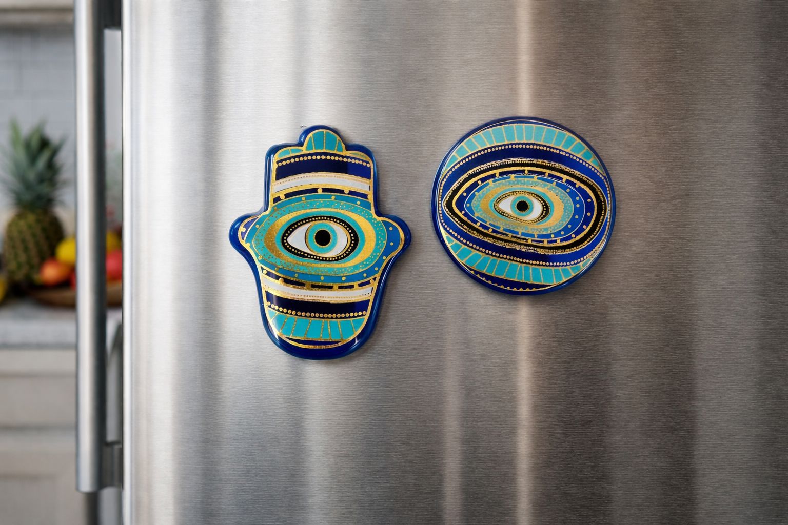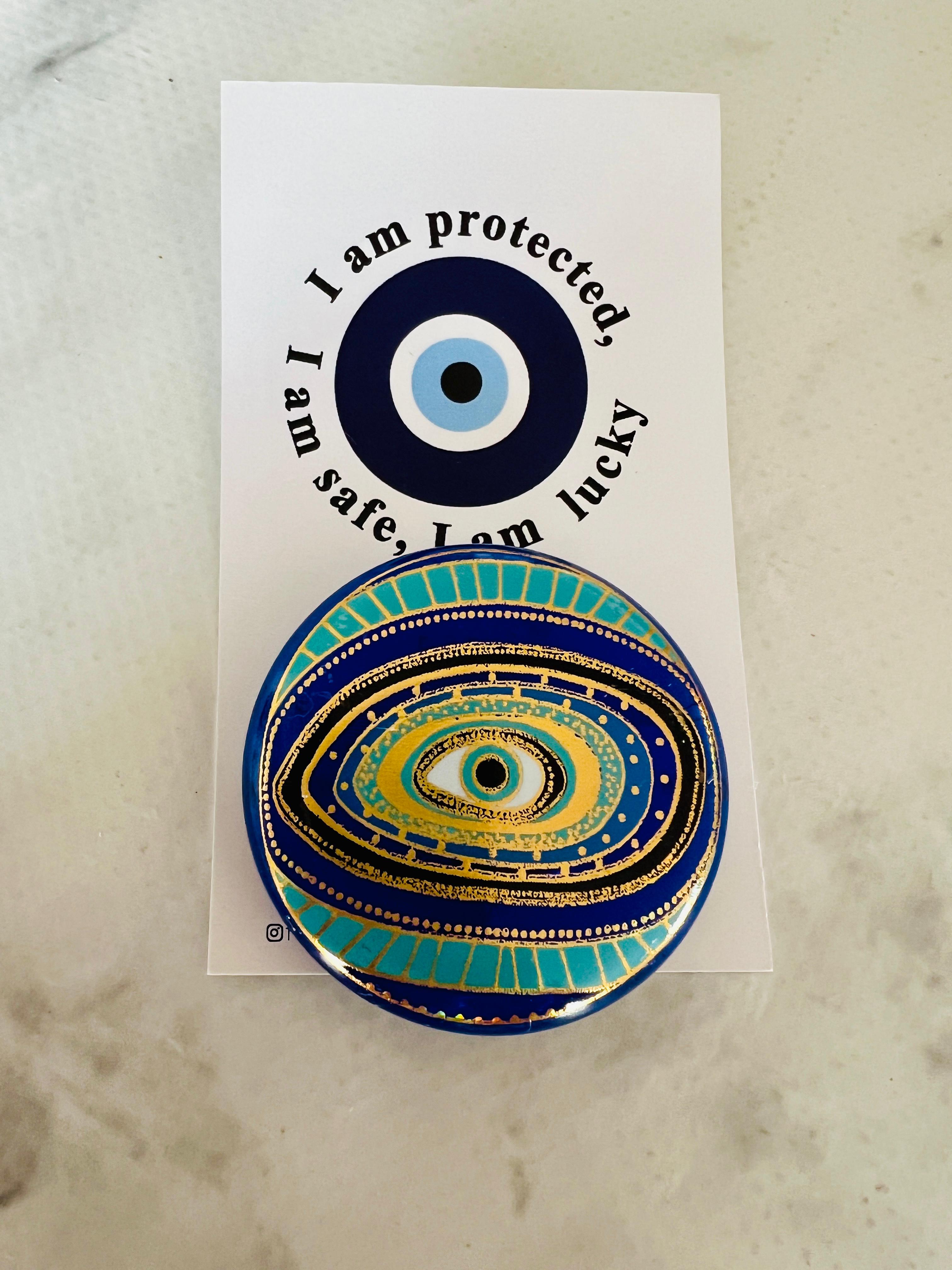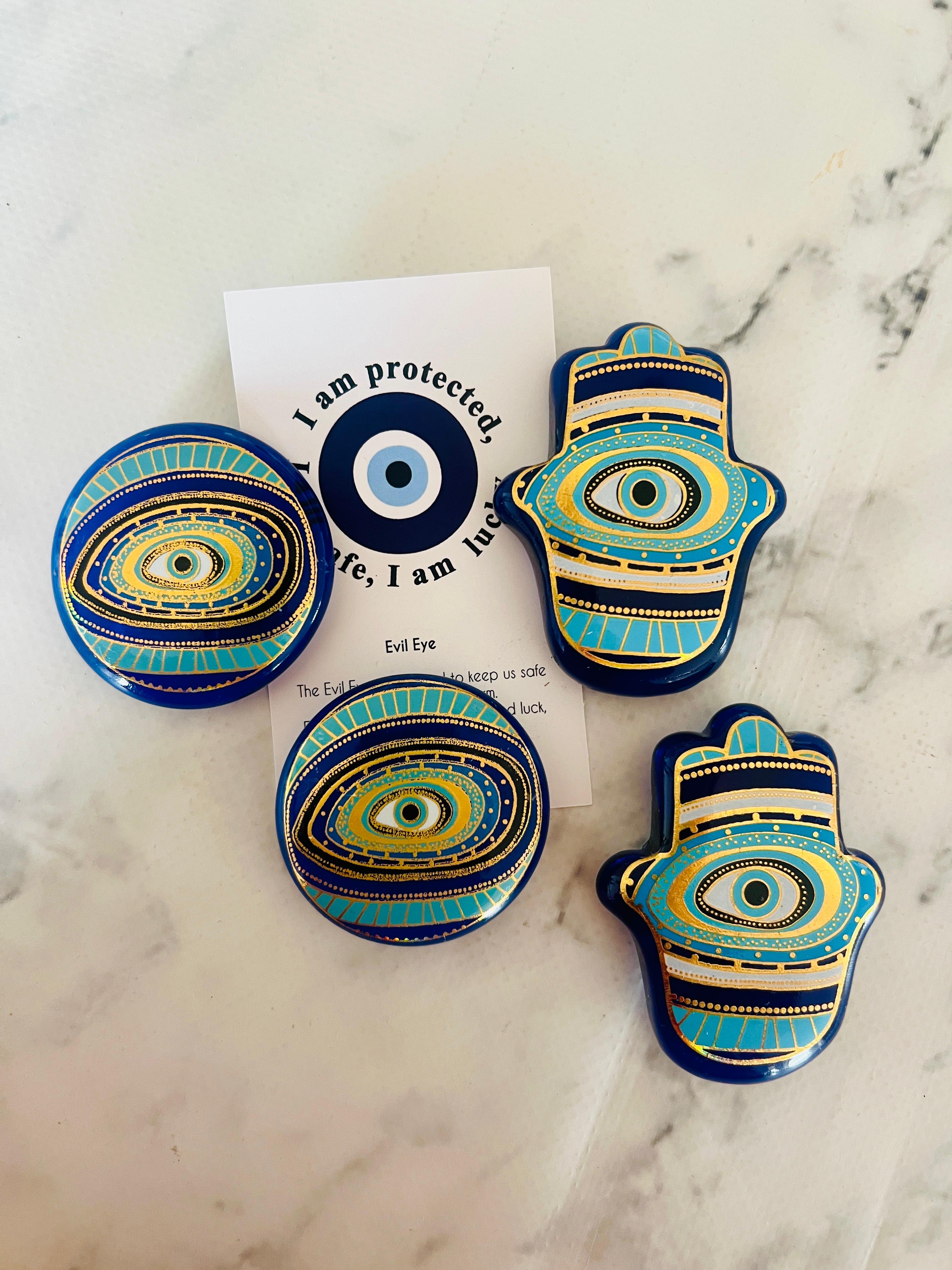 Pikka Cam Magnet, koruyucu sembollerin zamansız estetiğini modern bir yorumla bir araya getiren özel bir dekoratif objedir. El yapımı olarak üretilen bu cam nazar magnet, güçlü Evil Eye (nazar gözü) motifiyle yaşam alanlarınıza hem anlam hem de stil katar.